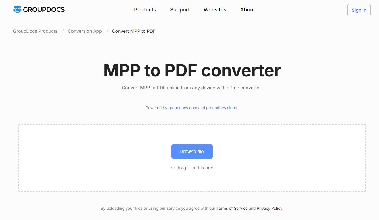 Tente explorar nosso aplicativo gratuito e leve MPP to PDF Converter, construído sobre o GroupDocs.Conversion Cloud REST API.