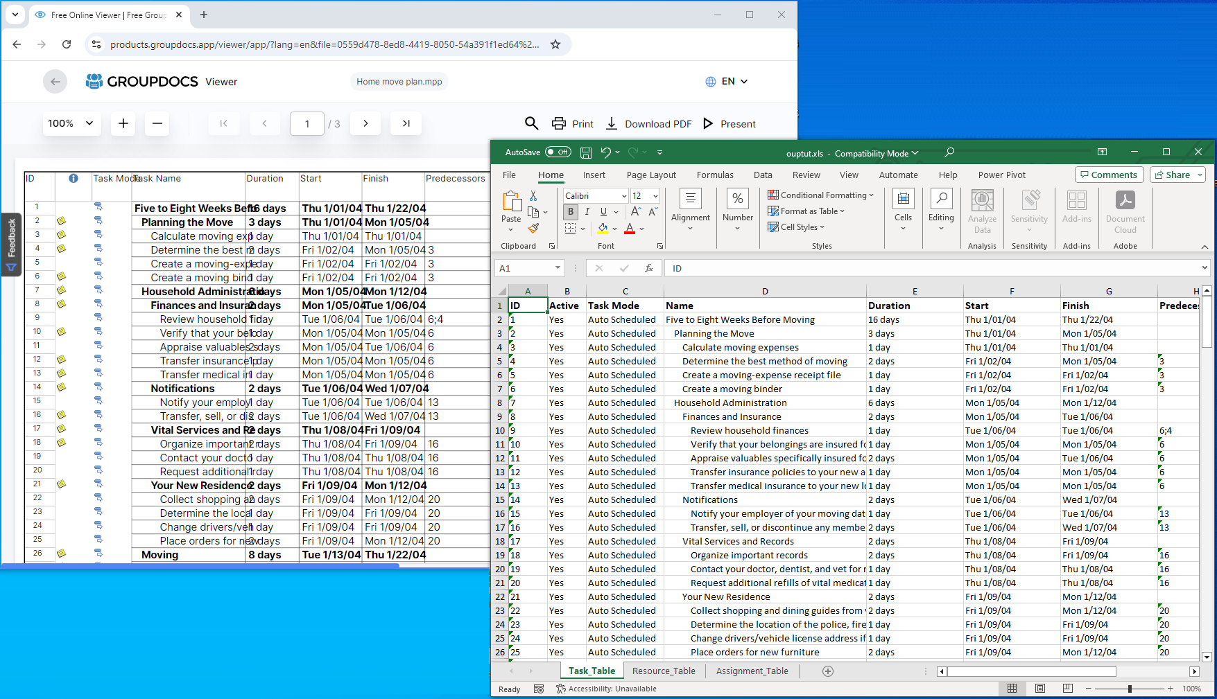- Tệp MS Project đầu vào được sử dụng trong ví dụ trên có thể được tải xuống từ Home move plan.mpp.